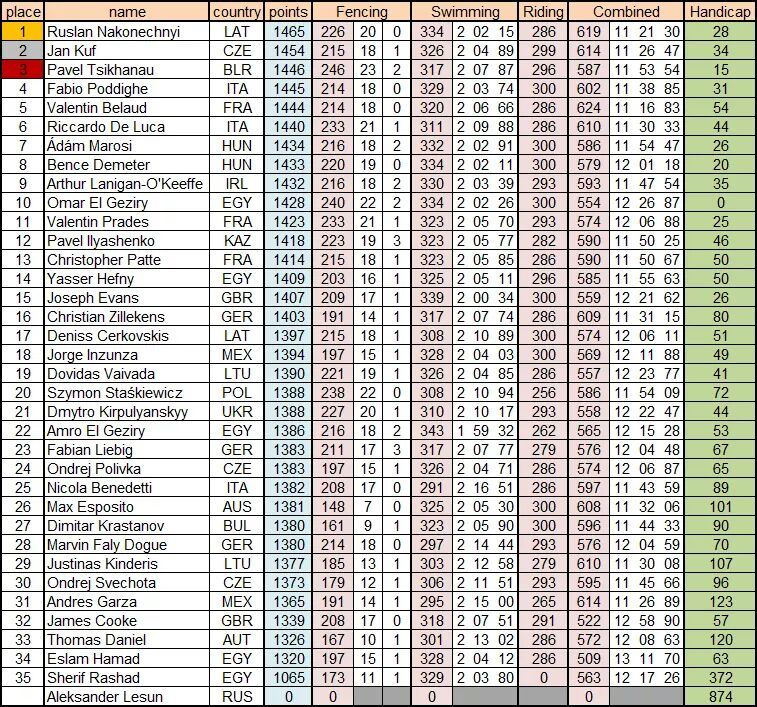 Summā Nakonečnijam 1465 punkti, tuvākos sāncenšus čehu Janu Kufu un baltkrievu Pāvelu Cihanavu apsteidzot par attiecīgi 11 un 19 sekundem. Deniss Čerkovskis ar 1397 punktiem ierindojās 17. pozīcijā.